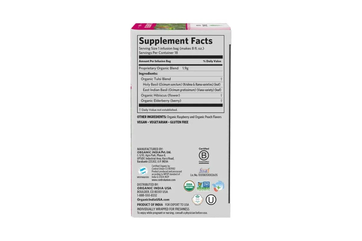 Tulsi Tea Raspberry Peach (18 bags) by Organic India is a caffeine-free, herbal supplement tea product that contains a mix of fruits and herbs. The primary ingredients include Krishna Tulsi (also known as holy basil), Vana Tulsi, Rama Tulsi, Hibiscus, Raspberry and Peach flavor. Organic India's Tulsi Tea Raspberry Peach is certified organic, non-GMO and gluten-free.