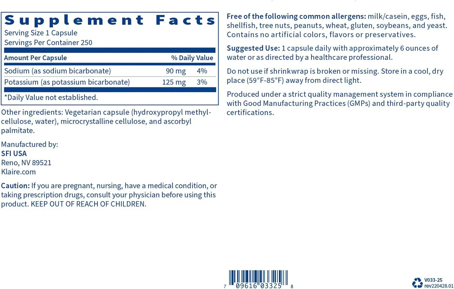 Klaire Labs Bi-Carb Formula, 250 Capsules