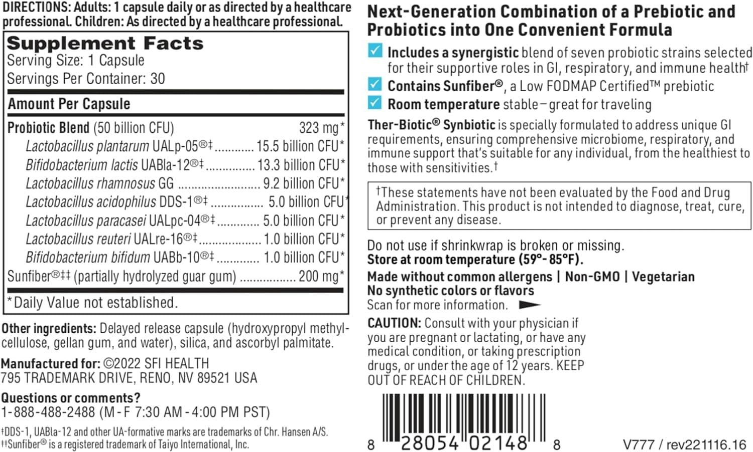 Ther-Biotic Synbiotic Probiotic is a supplement product offered by Klaire Labs. Each bottle contains 30 capsules. The product combines two beneficial types of bacteria - probiotics and prebiotics - in one formula to support digestive and immune health.