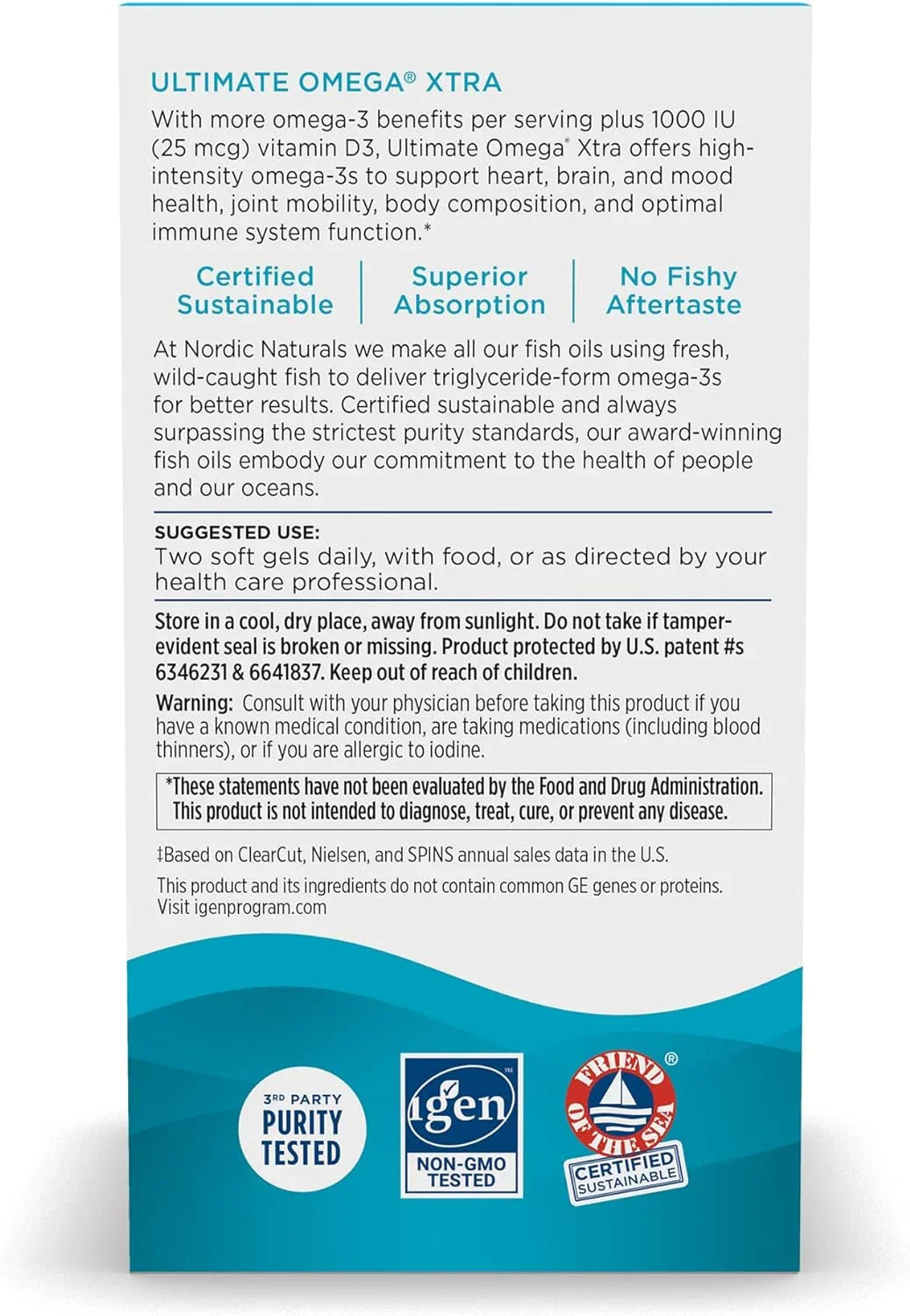 Ultimate Omega Xtra (Lemon) 60 Soft Gels is a dietary supplement product by Nordic Naturals. It includes highly-concentrated omega-3 fatty acids, EPA and DHA, in a 2:1 ratio, combined with Vitamin D3. Each serving contains 1640 mg of omega-3s, including 840 mg of EPA, 600 mg of DHA, and 2.5 mcg of vitamin D3.