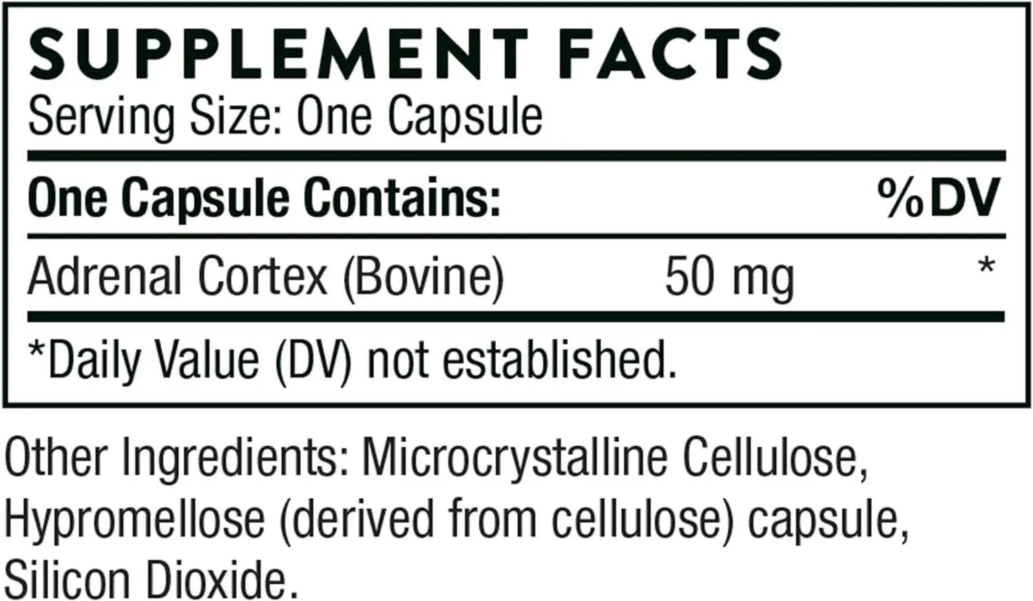 Adrenal Cortex (60 Capsules) – Thorne is a dietary supplement aimed at supporting healthy adrenal function. This product contains 50 mg of adrenal cortex tissue per capsule. Adrenal cortex tissue, sourced from a bovine (cow), is known for its adrenal-supportive benefits, particularly in maintaining the body's normal stress and immune responses.