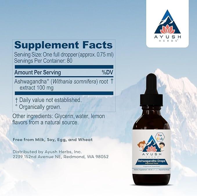 Ashwagandha for Kids 60ml (2 fl oz) by Ayush Herbs is a dietary supplement designed to support children's health. This product contains Ashwagandha (Withania somnifera), an adaptogenic herb traditionally used in Ayurvedic medicine. The liquid form allows for easy administration and dosage adjustment for children.