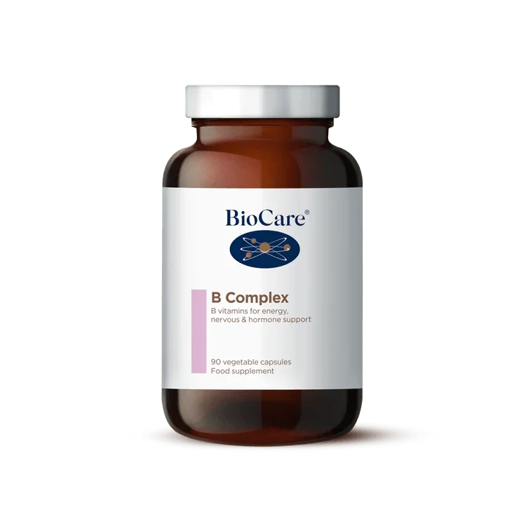 B Complex 90 Capsules by BioCare is a dietary supplement that provides a comprehensive blend of B vitamins essential for various physiological functions. The formula includes Thiamine (B1), Riboflavin (B2), Niacin (B3), Pantothenic Acid (B5), Pyridoxine (B6), Biotin (B7), Folate (B9), and Cobalamin (B12). Each capsule is designed to support normal energy-yielding metabolism, psychological function, and the reduction of tiredness and fatigue.