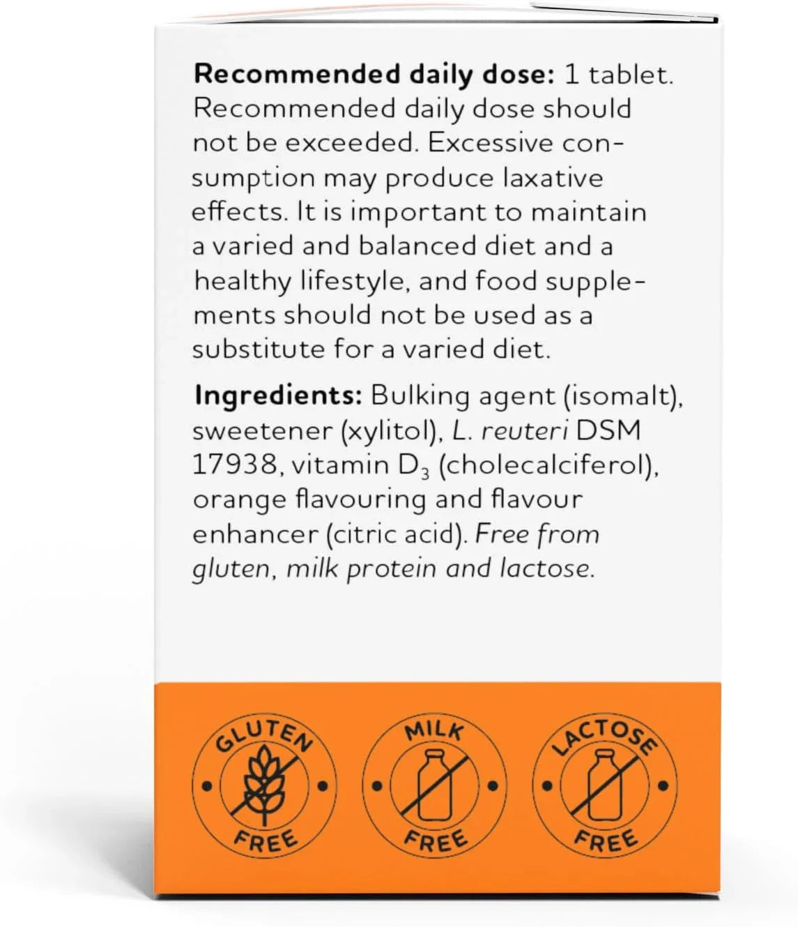 Each tablet contains a dose of Lactobacillus reuteri DSM 17938, with at least 100 million live active cultures. This specific strain is clinically shown to help maintain a healthy balance of gut microflora and support overall digestive health. The added Vitamin D3 contributes to the maintenance of normal bones and teeth, supports normal muscle function, and plays a role in the normal function of the immune system.