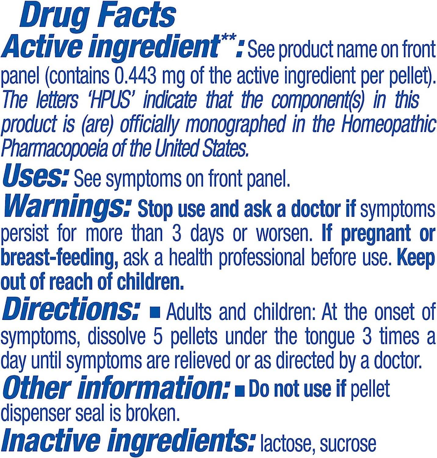 As per the manufacturer's instructions, adults and children aged 2 or above should dissolve five pellets in the mouth three times a day until symptoms are relieved. It's recommended not to eat or drink anything 15 minutes before or after taking the pellets. This product is FDA-regulated to ensure its safety and efficacy.