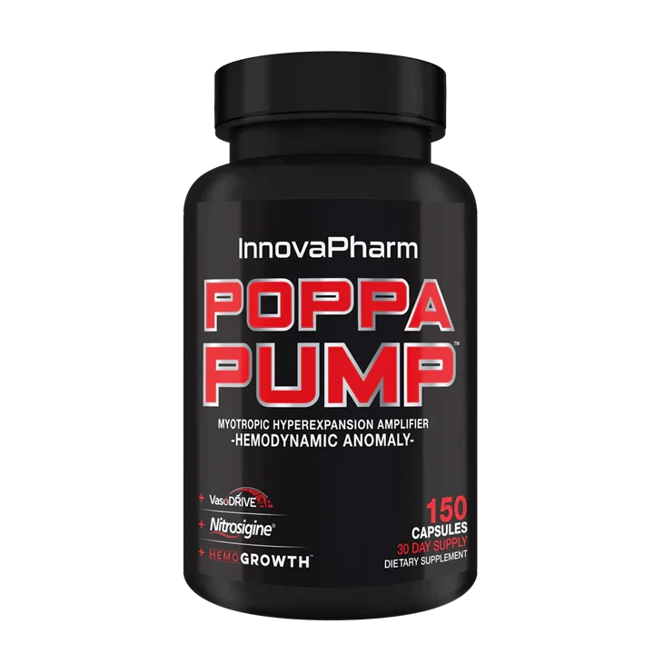 Innovapharm Poppa Pump 150 Caps is a nutritional supplement designed to support muscle performance and endurance. Manufactured by Innovapharm, this product features a potent blend of active ingredients, including L-Citrulline and Beta-Alanine, known for their role in enhancing nitric oxide production and reducing muscle fatigue. Each capsule is formulated to help athletes and fitness enthusiasts achieve optimal workout results by promoting increased blood flow and improved nutrient delivery to muscles.