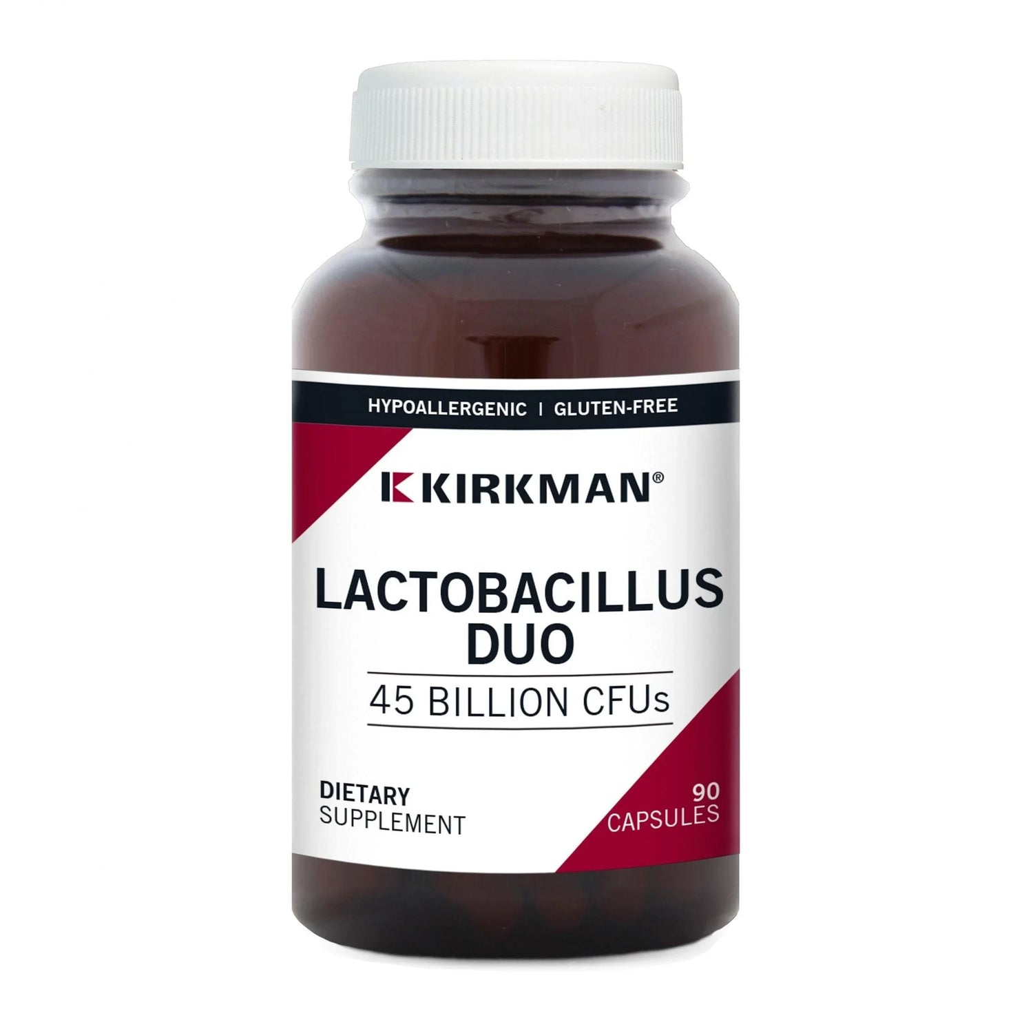 Lactobacillus Duo (Hypoallergenic), 90 Capsules is a health supplement produced by Kirkman Laboratories. It contains two probiotic strains, Lactobacillus rhamnosus and Lactobacillus acidophilus, known for their beneficial effects on gastrointestinal health. Each capsule delivers a total of 30 billion colony-forming units (CFUs) of these probiotics.