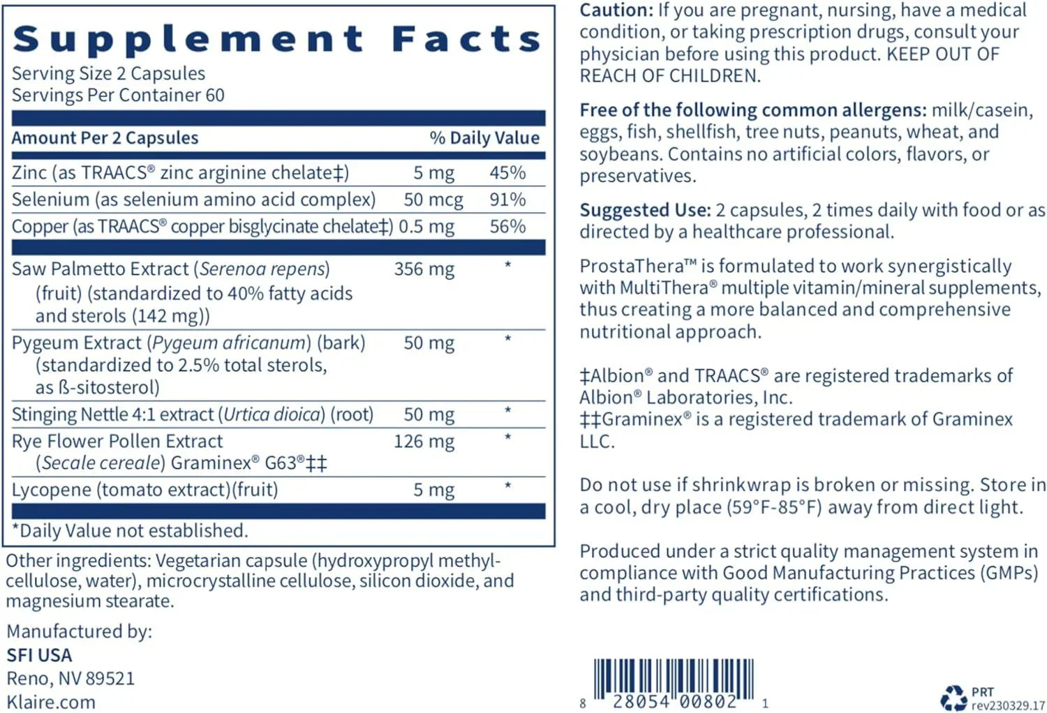 The ProstaThera 120 Capsules are manufactured by Klaire Labs, a trusted brand specializing in hypoallergenic, high-quality nutritional supplements. All Klaire Labs products are manufactured under strict quality control standards to ensure safety and efficacy.