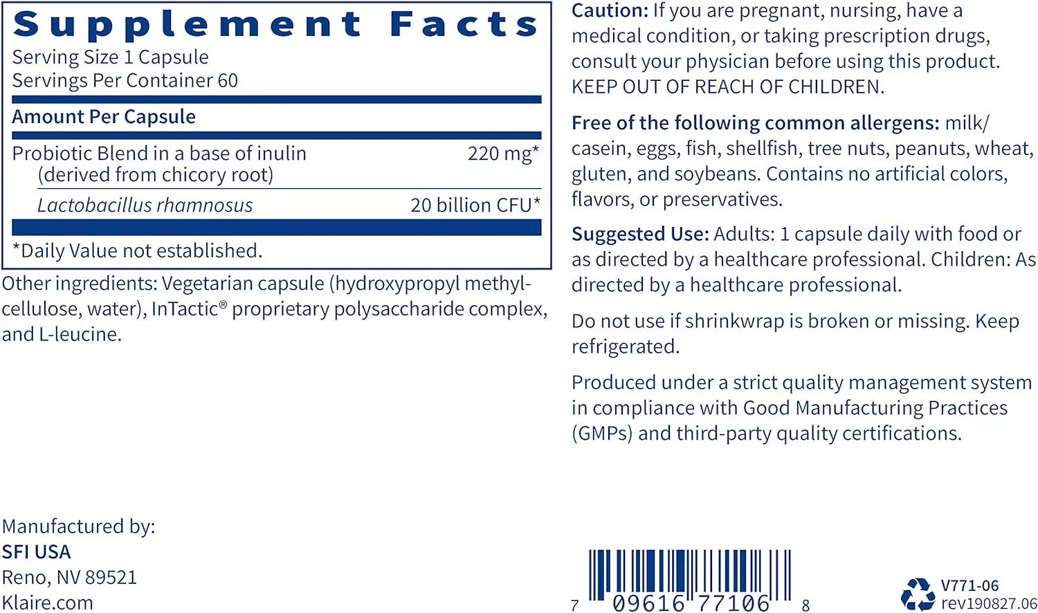 Ther-Biotic Factor 1 is a dietary supplement produced by Klaire Labs. Each bottle of this product contains a total of 60 capsules. This product is composed of the active strain Lactobacillus rhamnosus, which is a probiotic.