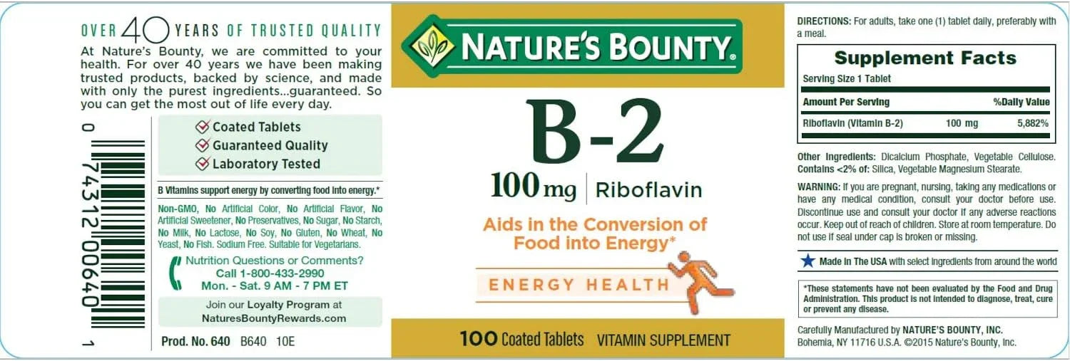Nature's Bounty Vitamin B-2, 100 mg, 100 Tablets