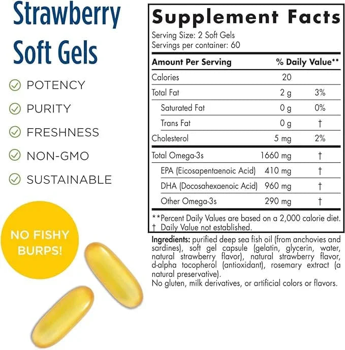 Each bottle contains 120 strawberry-flavored soft gels. One serving size is two soft gels, providing a total of 580mg of DHA and 90mg of EPA. Other ingredients in the product include purified deep sea fish oil, soft gel casing (gelatin, water, glycerin, natural strawberry flavor), natural strawberry flavor, d-alpha tocopherol, rosemary extract used as a natural preservative.
