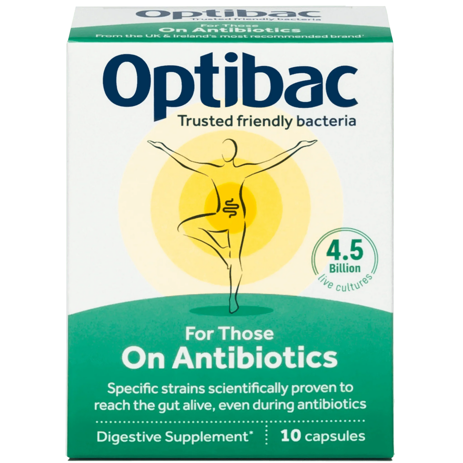 OptiBac 'For Those on Antibiotics' is a pack of 10 probiotic capsules specifically designed to supplement a course of antibiotics. These capsules contain two types of live microorganisms, Lactobacillus acidophilus Rosell-52 and Lactobacillus rhamnosus Rosell-11. Both are friendly bacteria commonly found in probiotic food supplements. These strains are resistant to acid, bile salts, and antibiotics, thus ensuring they reach the gut alive where they can confer their health benefits. Each capsule guarantees four billion CFUs (Colony Forming Units) when ingested.