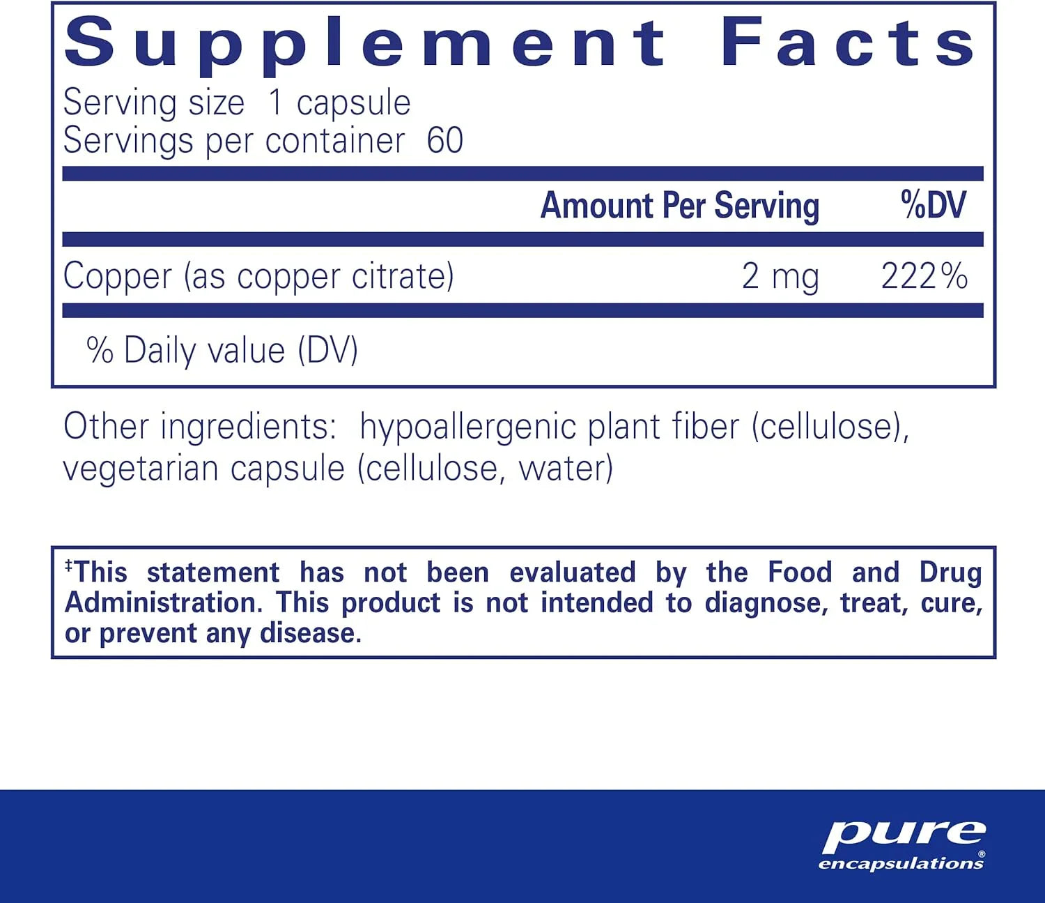 Pure Encapsulations Copper (citrate) is made from hypoallergenic, vegetarian ingredients. It is free from artificial additives, allergens, and genetically modified organisms, making it safe for consumption. The main ingredient is copper citrate, a form of copper that is more readily absorbed by the body. Each capsule contains 2mg of copper (as copper citrate).