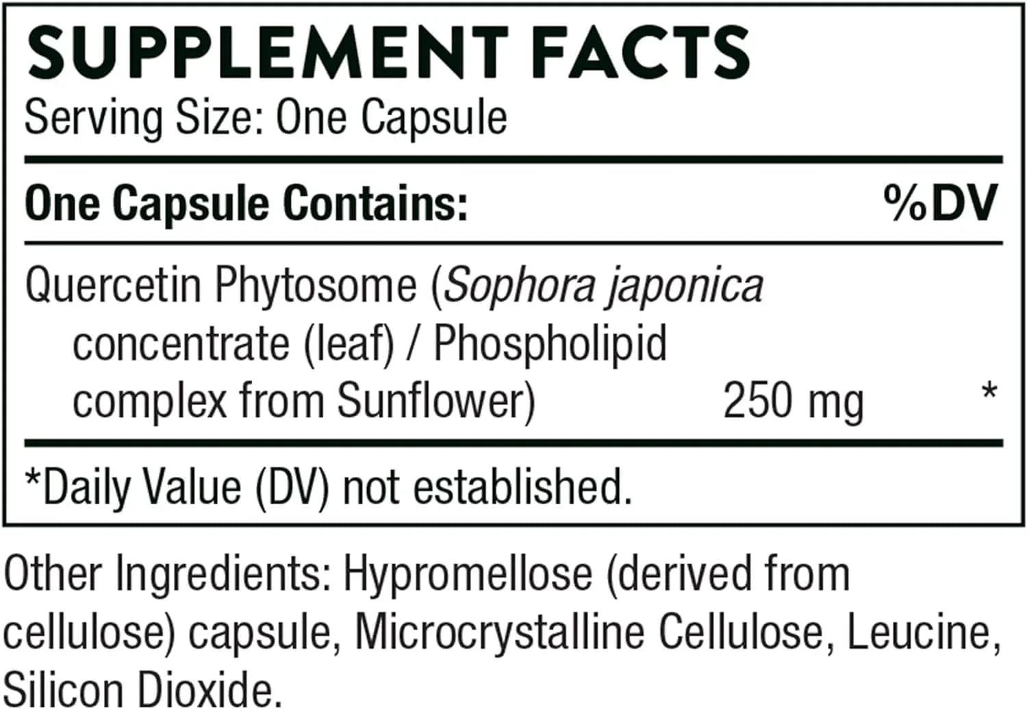 Each capsule contains 250 mg of Quercetin Phytosome, combining quercetin with sunflower-sourced phospholipids to form a phytosome complex. This complex is designed to improve the solubility and bioavailability of quercetin, making it more effective than standard quercetin supplements.